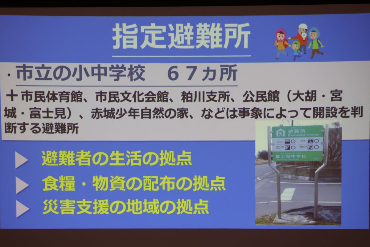 講義後、荒牧町の自主防災倉庫や今回導入した防災用蓄電池を見学して終了となりました。