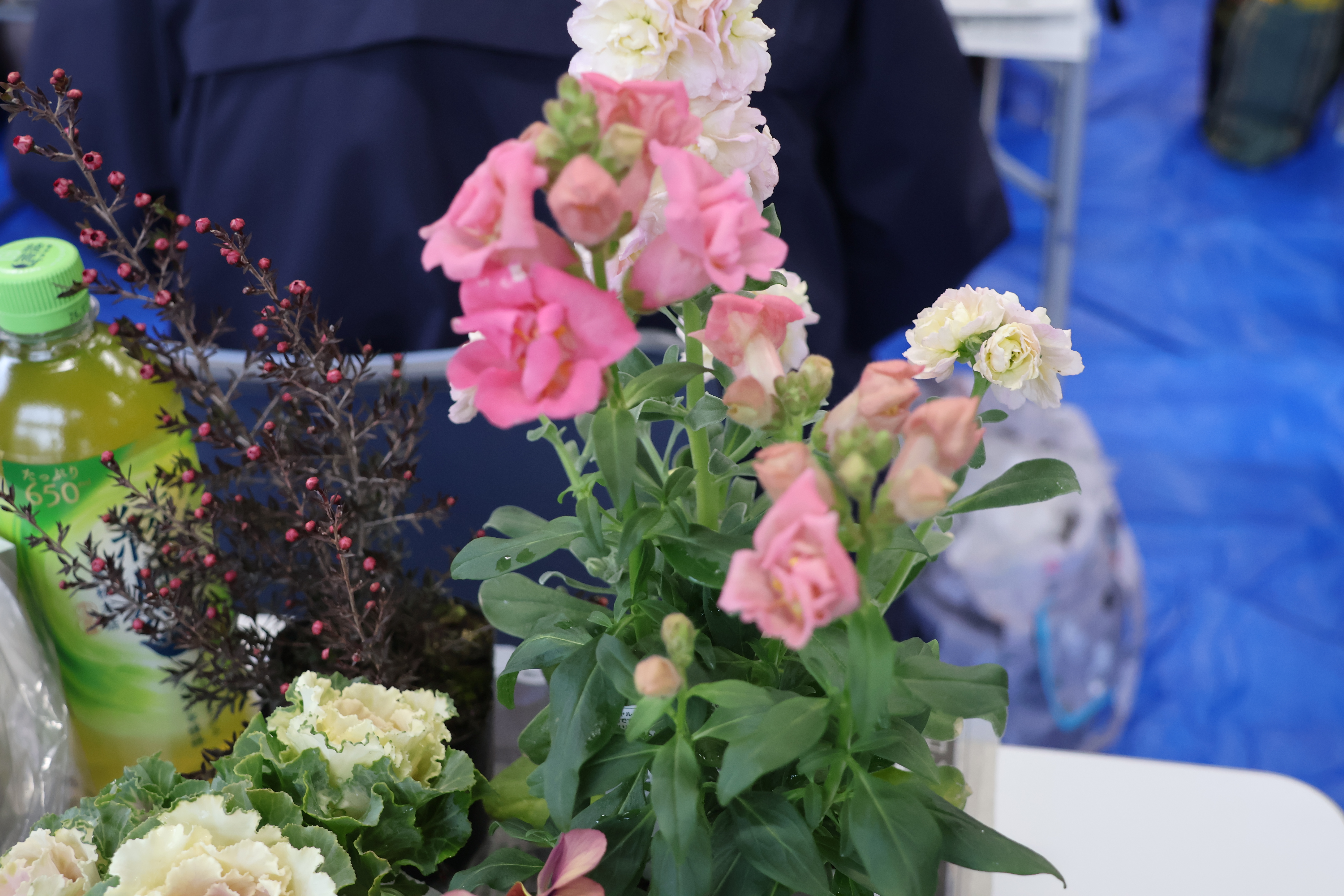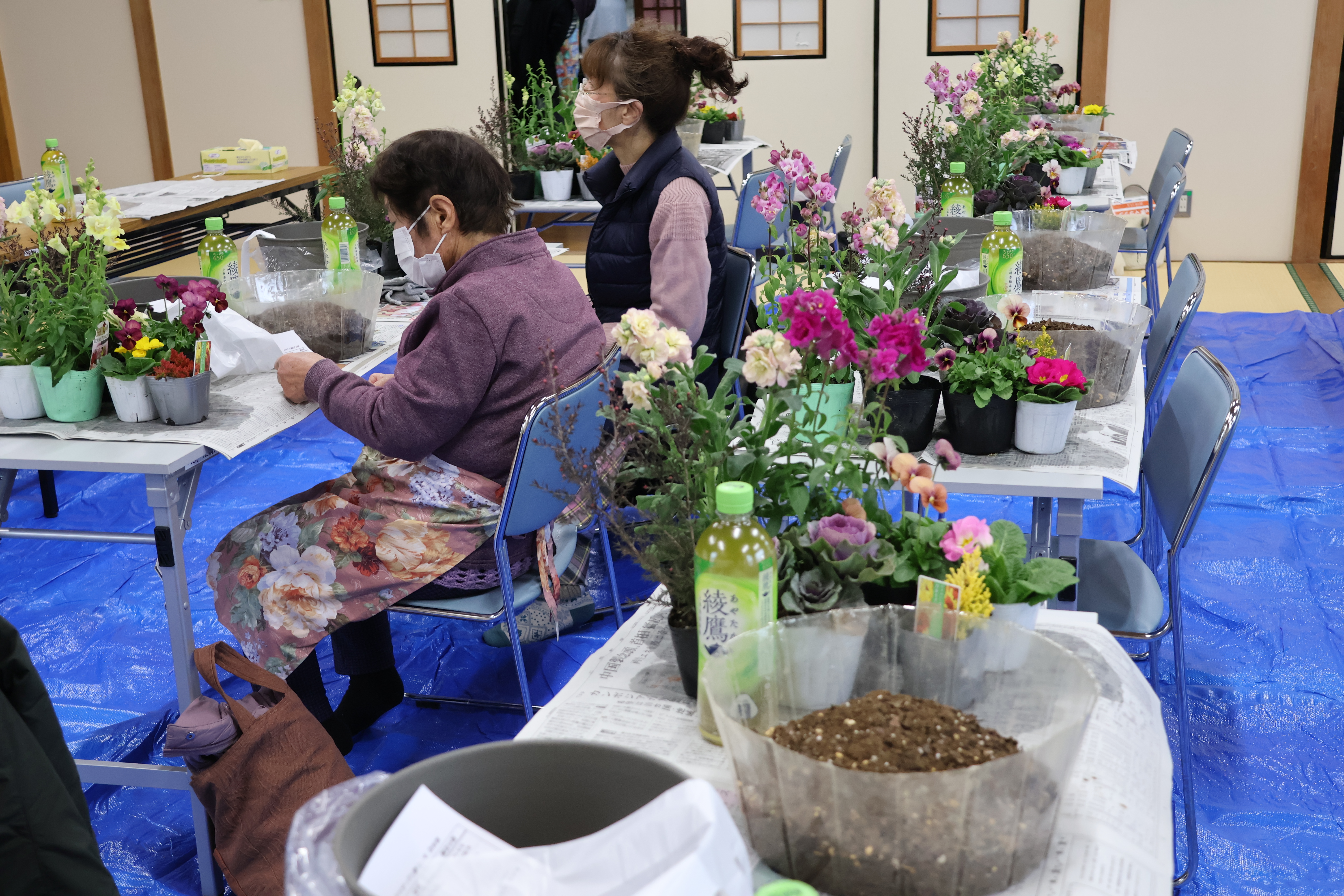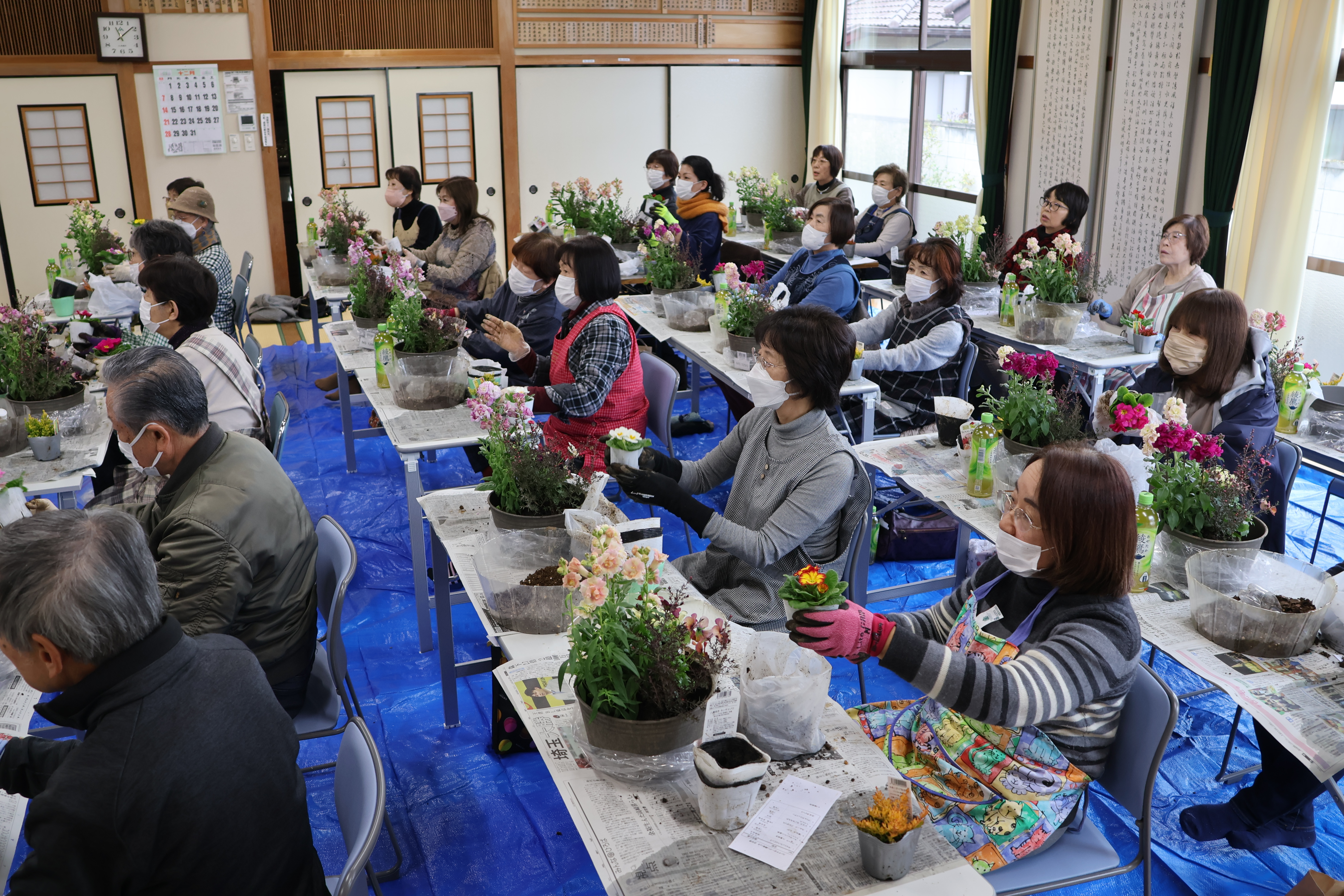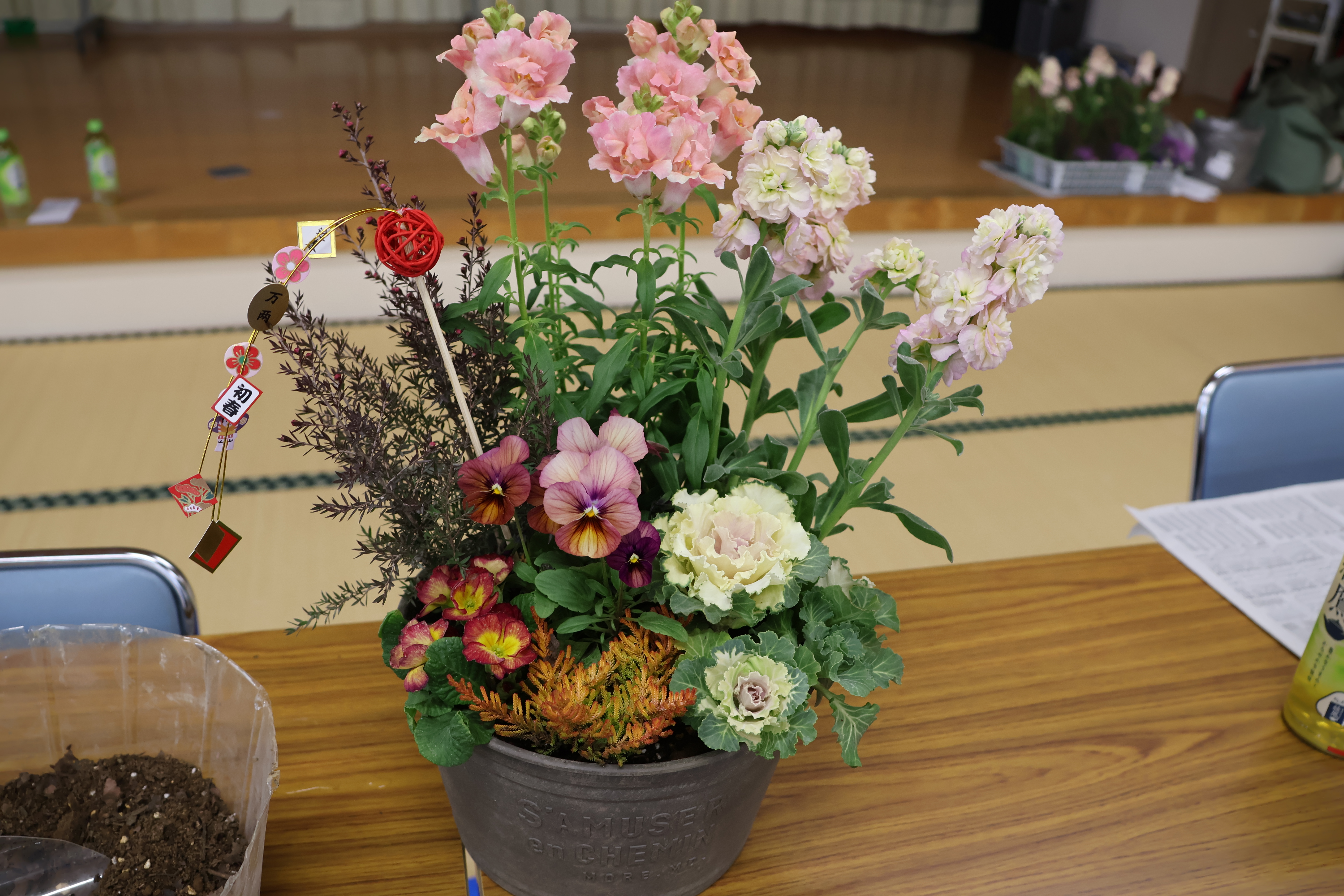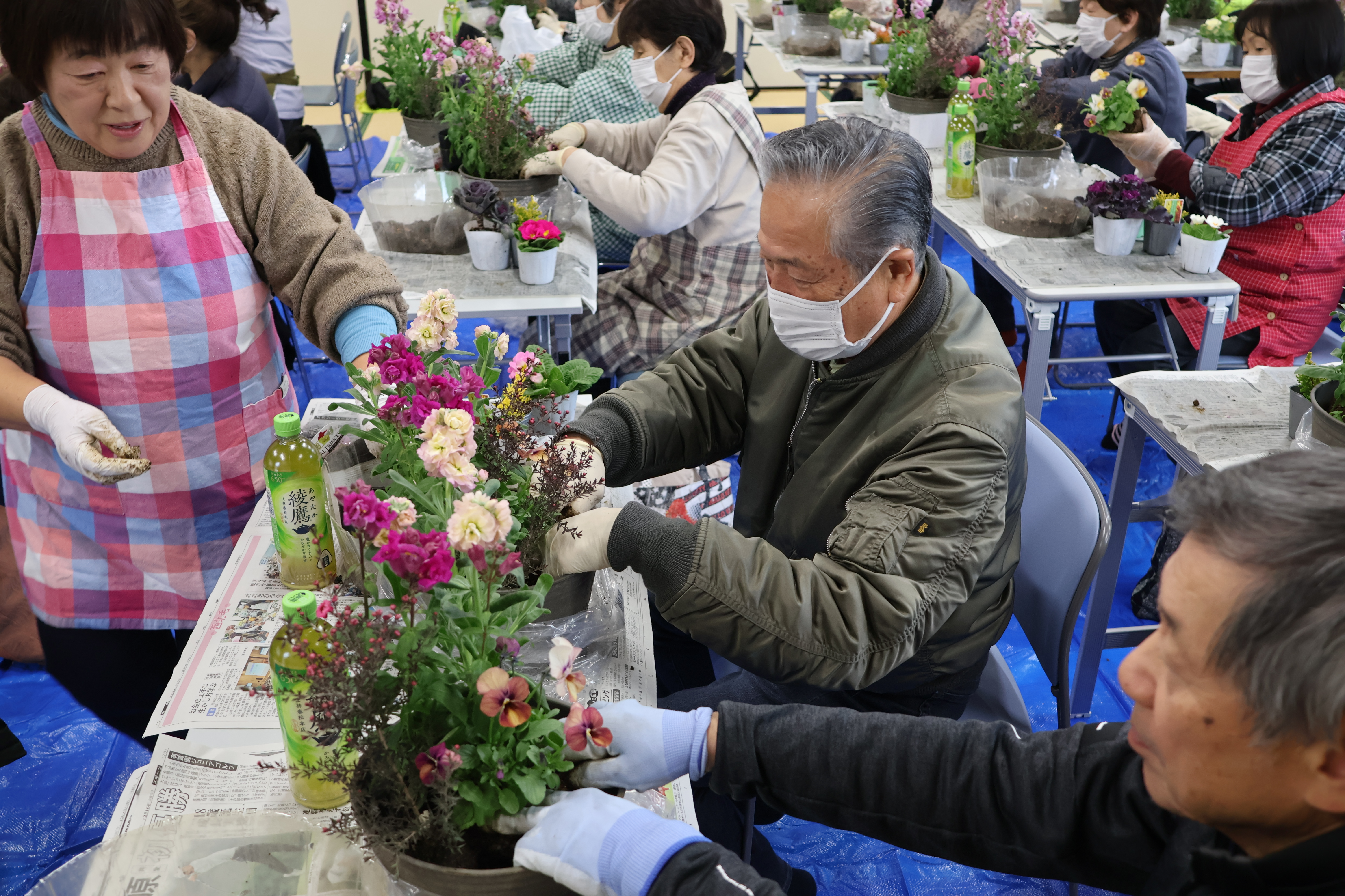 12月の「ふれあいいきいきサロン」は、お正月にふさわしい華やかな寄せ植え教室で28名の参加があり、今回が初めての参加者も多数いました。