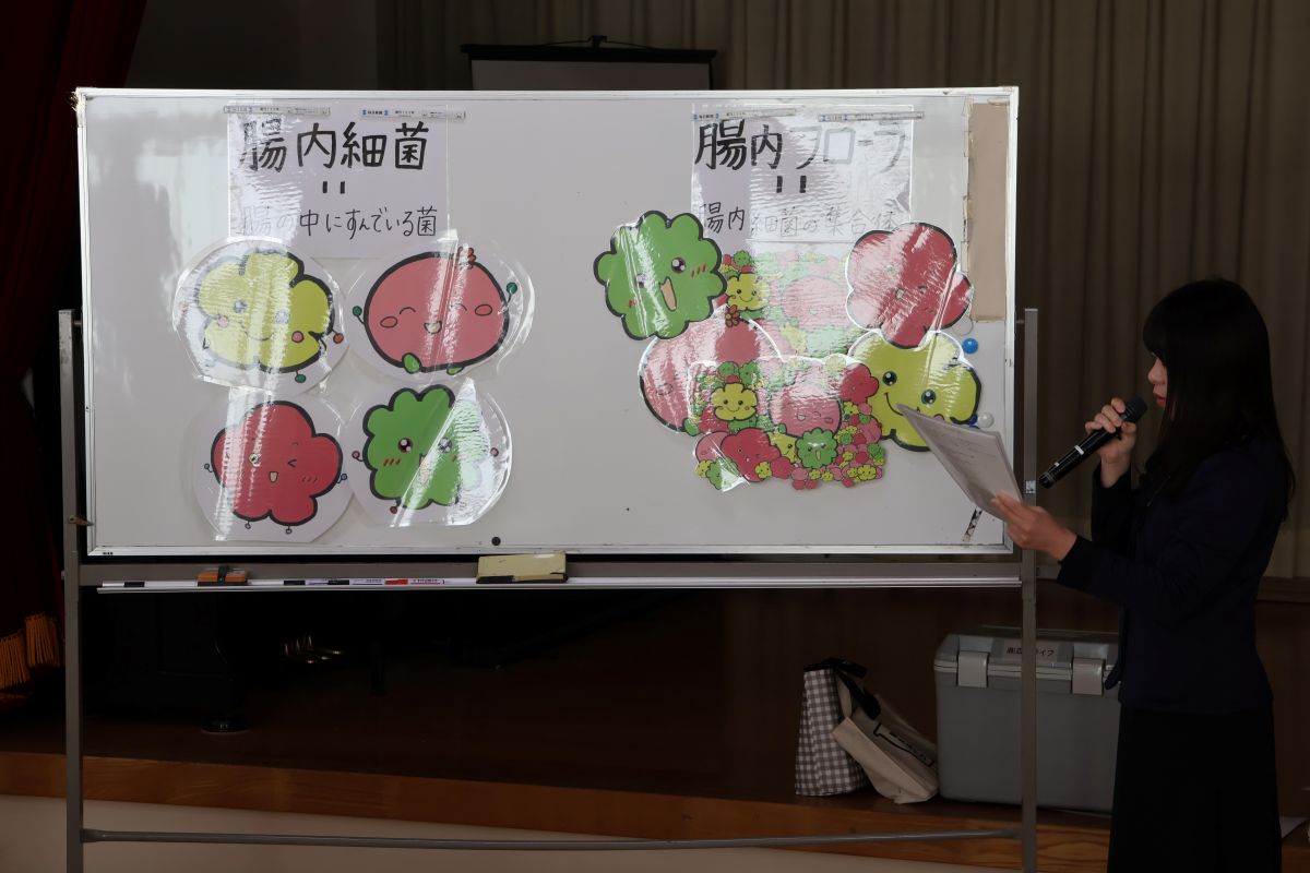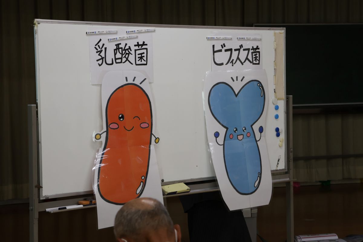 講話では骨の健康のお話のほか、各自の腸年齢チェックシートを基に、より良い腸内フローラやビフィジス菌・乳酸菌の働きや日々の食生活習慣を通じて将来の健康につながるお話しがありました。