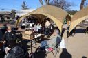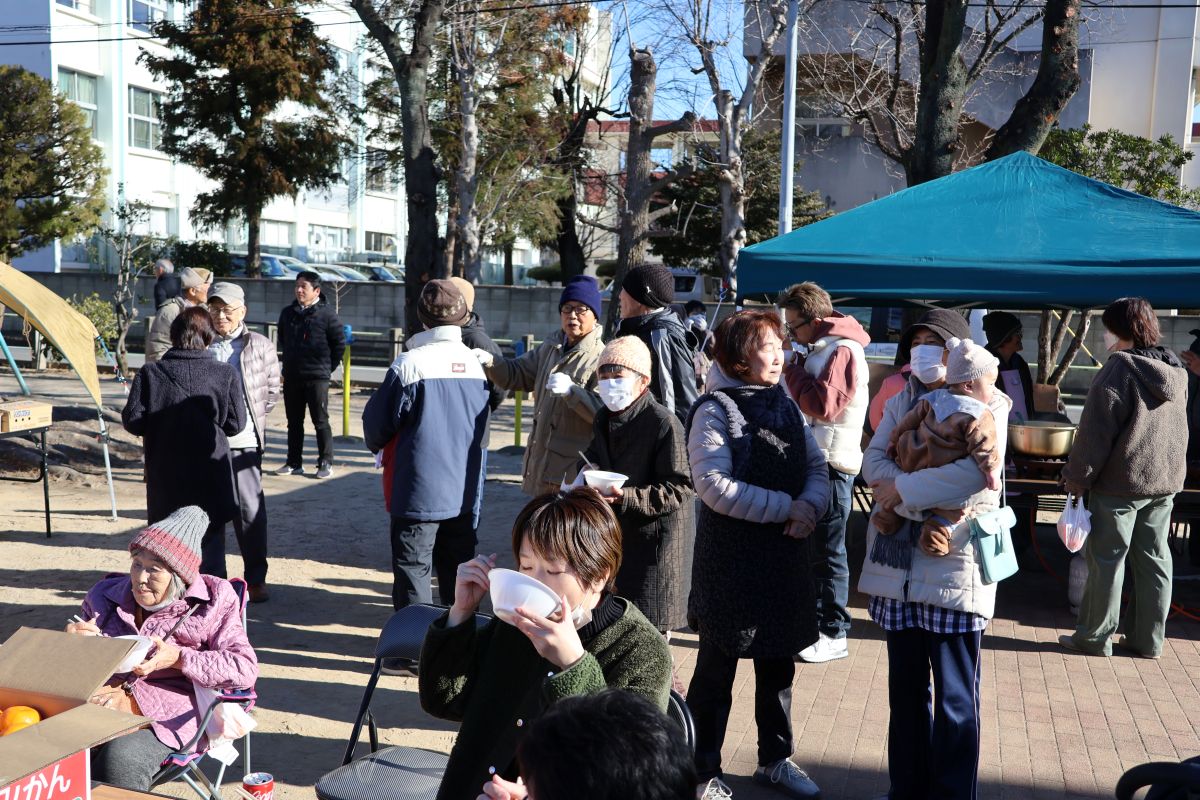 参加者には暖かい「豚汁」、稲荷ずし」、「ミカン」、「飲み物」などが振舞われ、子供達には「お楽しみ抽選」、「グラウンドゴルフ」、「輪投げ」や「的当てのゲーム」に加え、今年は「竹とんぼつくり」が加わり、お年寄りから子供までお正月の交流を楽しんでいました。