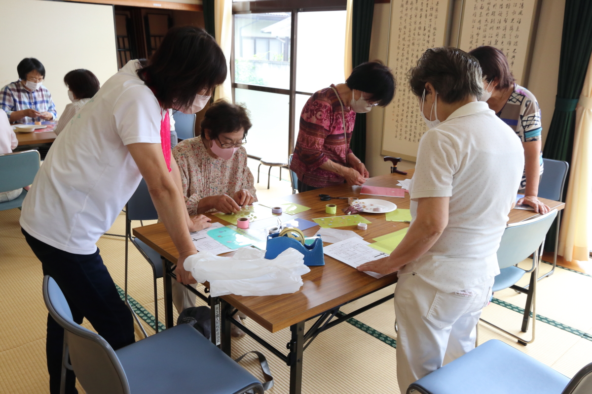 はじめにマスクケースと書類入れの作り方です。参加者は3か所のテーブルに分かれ、役員が用意したクリアファイル・マスキングテープ等を定規やハサミを使っての細かい手作業でした。皆さん手際よく作って完成品を比べあっていました。
