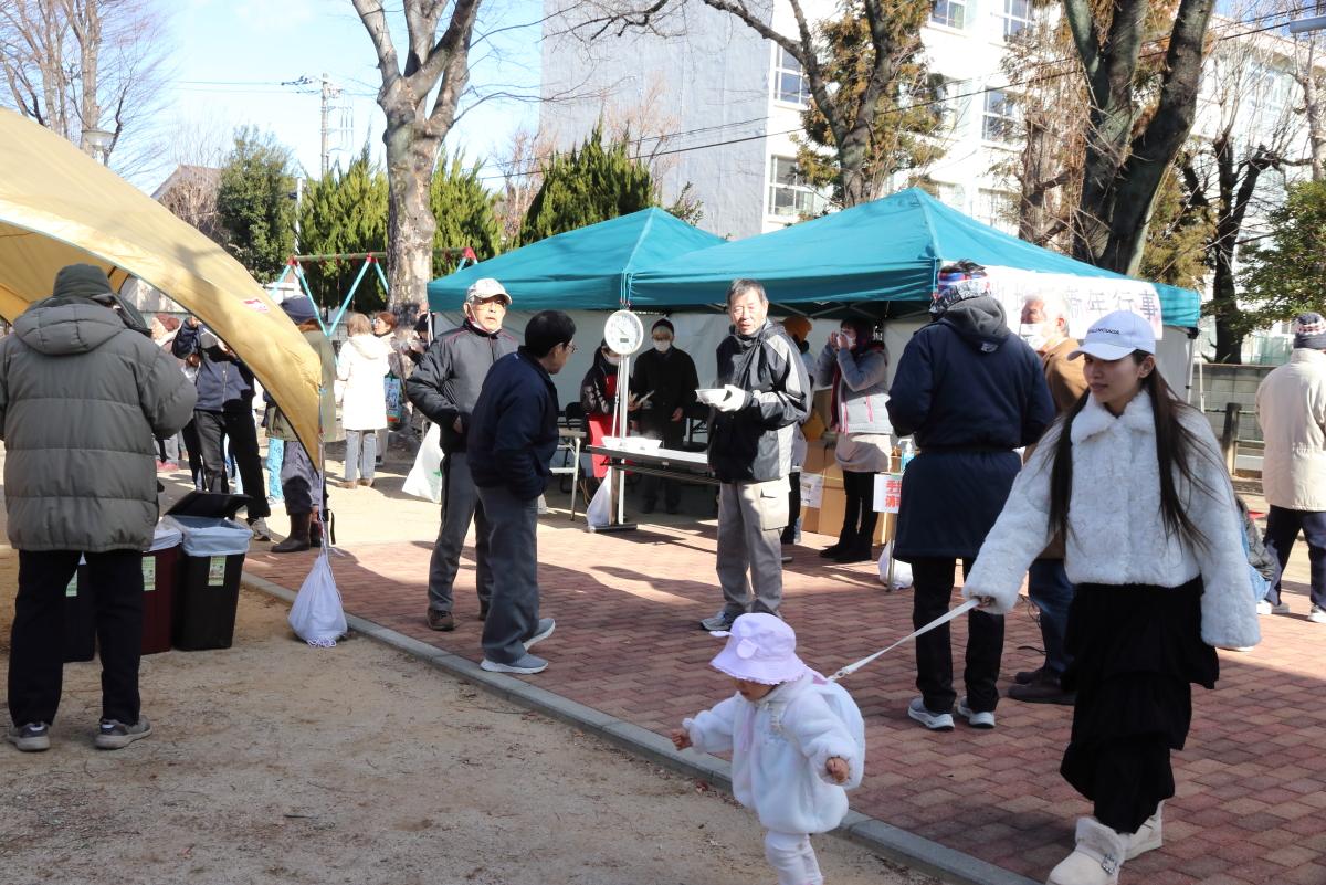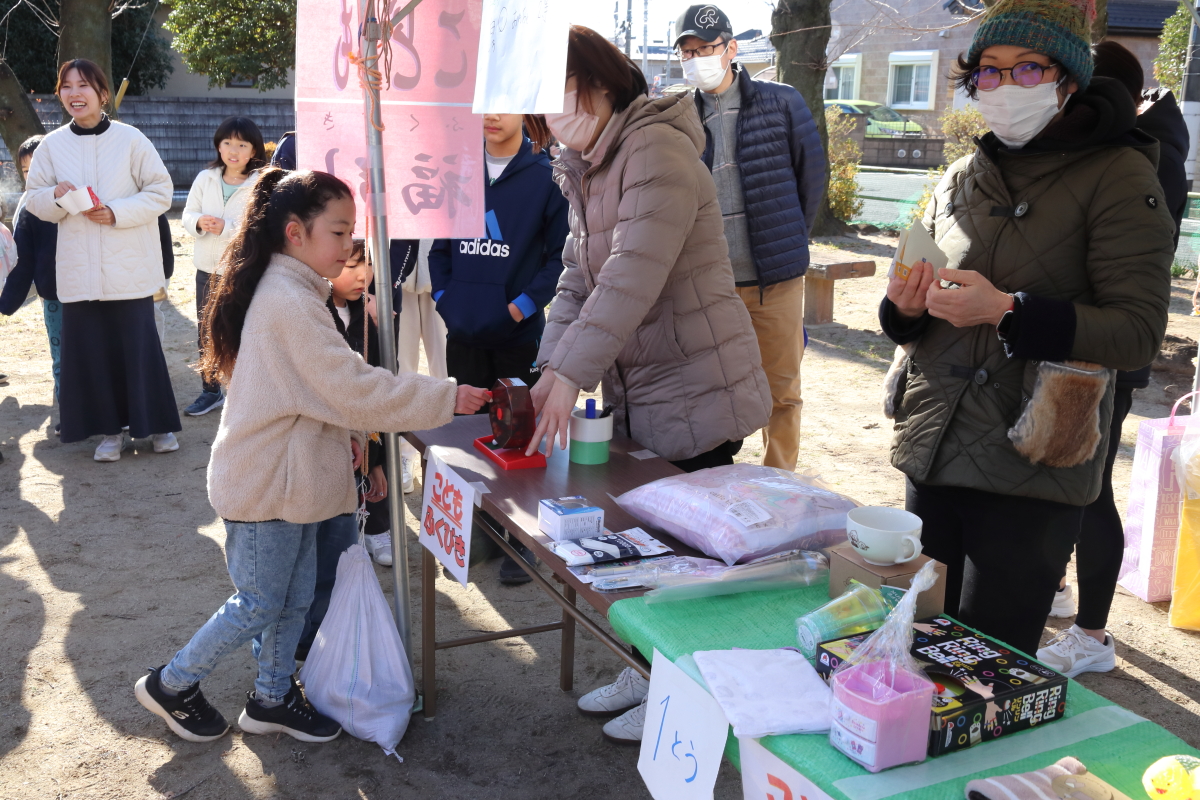 参加者には、豚汁、甘酒、お酒など降り舞われ、みかん・稲荷寿司・飲み物やお菓子等の入ったビニール袋が配られました。子供達には、ガラポンくじでいろいろな景品が当たり、玩具やお菓子を手にして「ゲームコーナー」で明るい声が行きわたっていました。大人たちも、豚汁や甘酒で今年もお互いに元気にと話も弾み、親睦を深めご家族共々楽しい一時を過ごしていました。