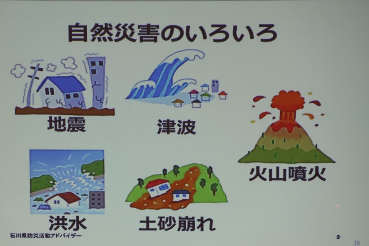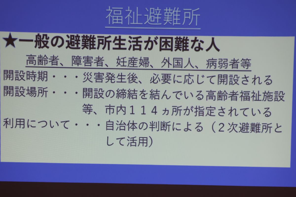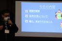 始めに要支援者輸送訓練では、春らんらんの木暮さんから「車いす」での搬送の留意点を実技で受けました。防災士からの講話では「避難所の概要」、「自然災害について」や「備え、自分でできること」をスライドを使用し講義を受けました。
