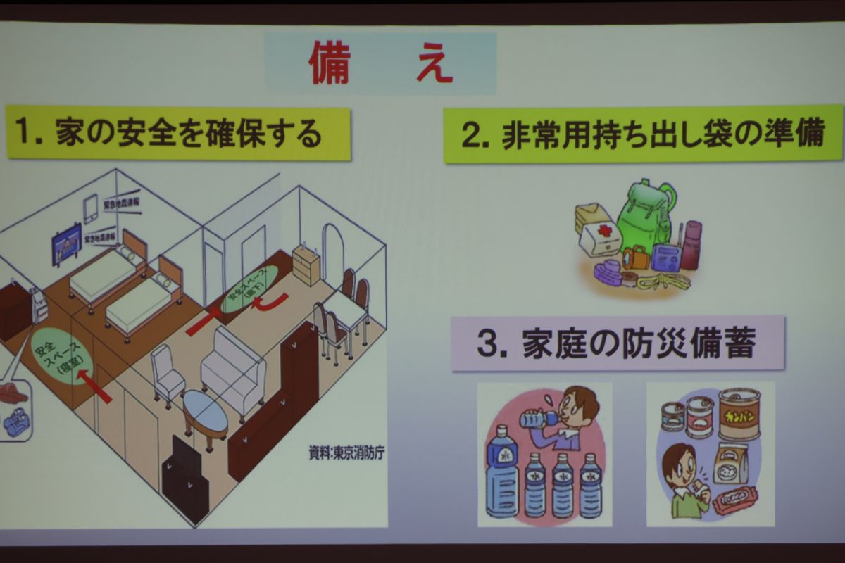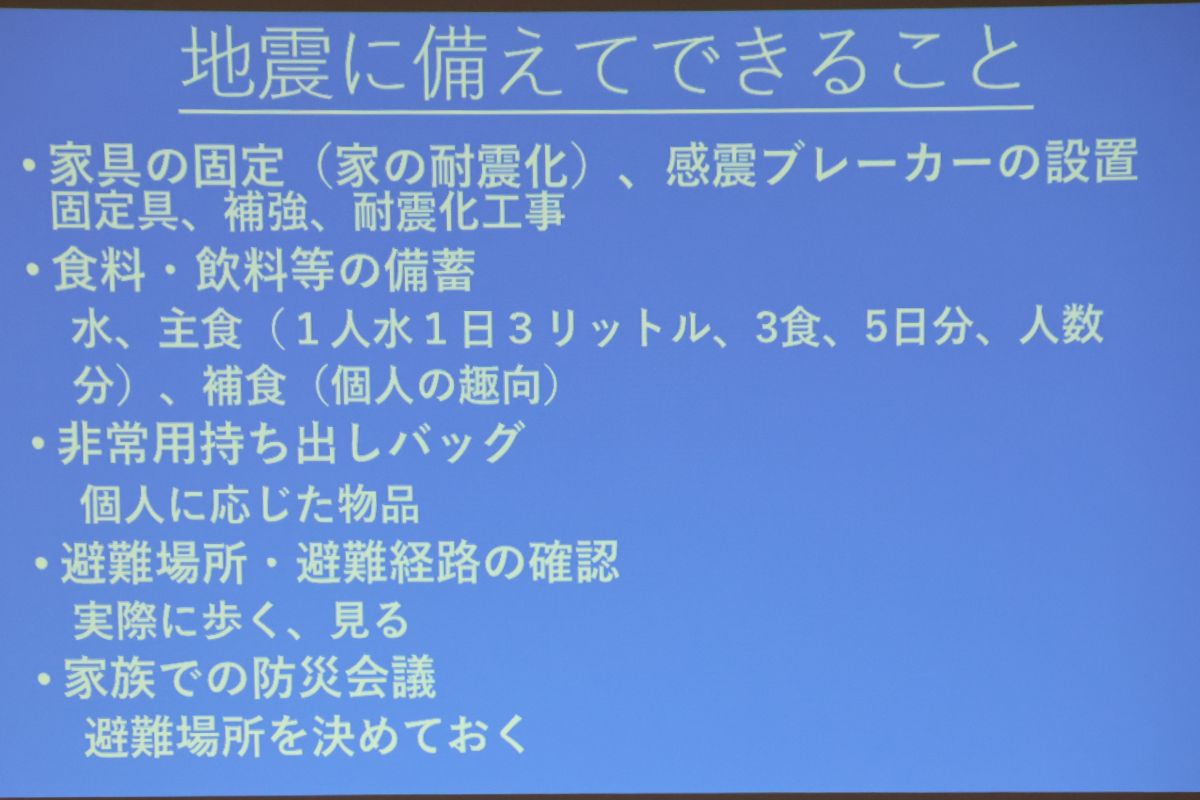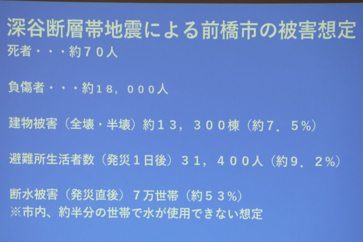 前橋市でも震度6以上の地震発生確率は能登半島や熊本とほぼ同様の確率であること、深谷断層帯地震による本市の被害想定は死者約70人、負傷者約1万8千人に加え約半数の世帯に断水被害が想定されているとの説明がありました。各自が家具の固定や食料等の備蓄、家族で話し合い等、日ごろの備えを行動に起こすことが大切、また応急救護関係ではDVDを視聴し救急車が来るまでの対応が重要とだと学びました。