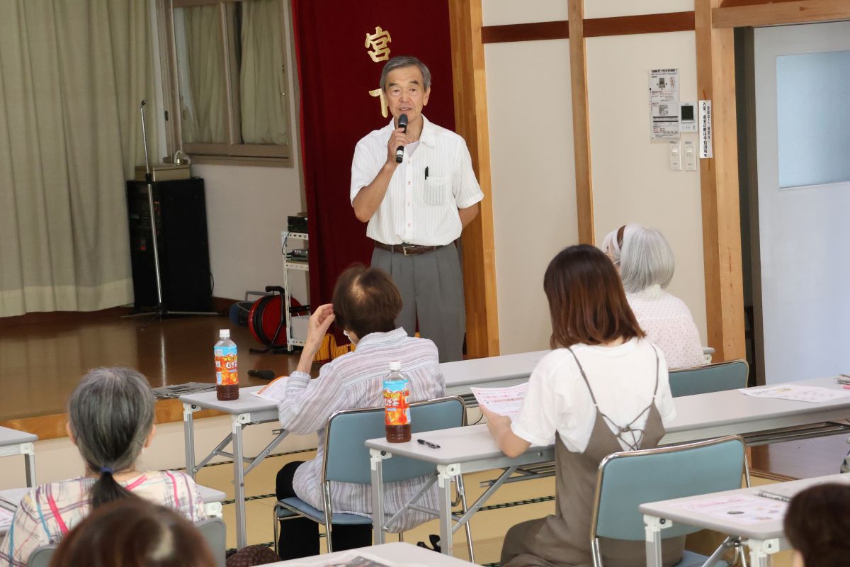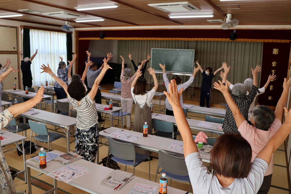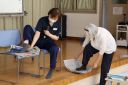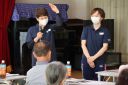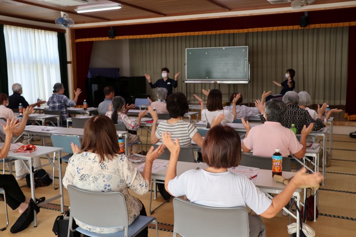 講師の木村指導員からは参加者(高齢者)に合わせた丁寧で理解しやすい口調で、水分摂取不足や長時間体を動かさないことで引き起こすエコノミークラス症候群、生活不活発病の予防の運動や水分を十分とりトイレを我慢しないなどのポイント、感染症の予防のために「うがい・手洗い」をしっかりすることなどの講義、予防実技がありました。