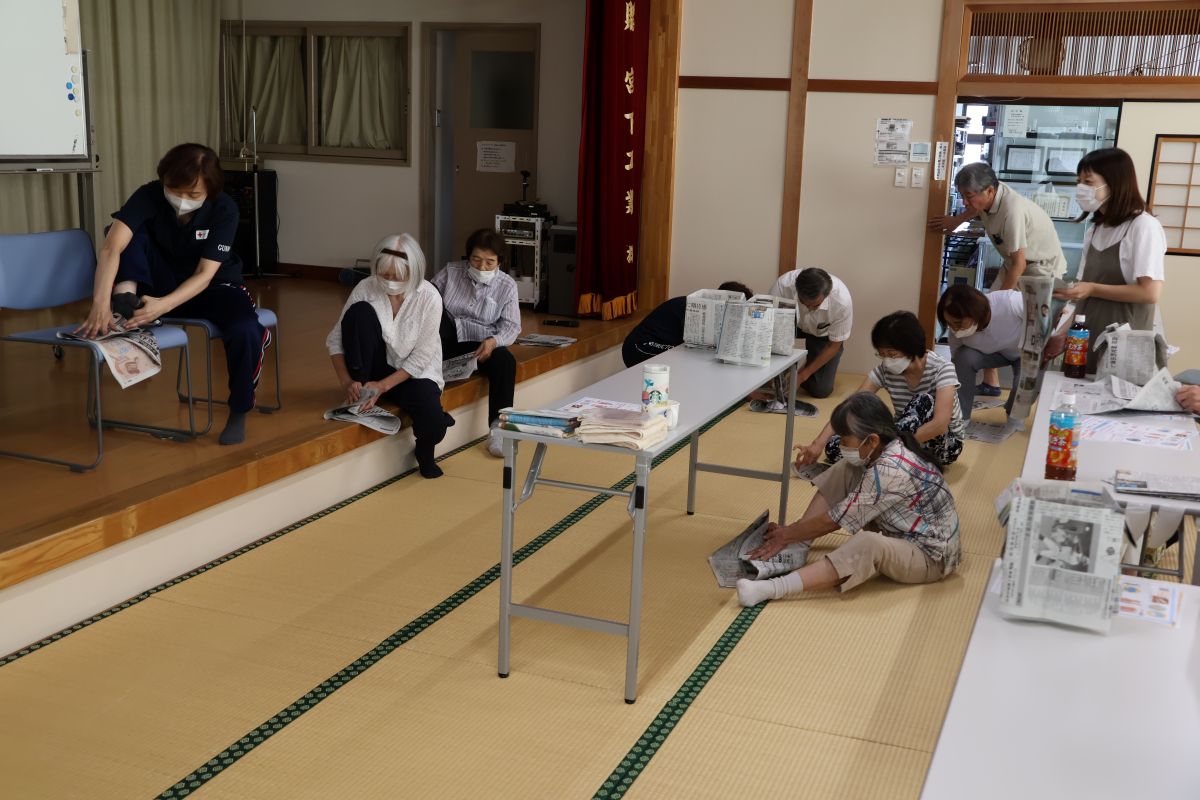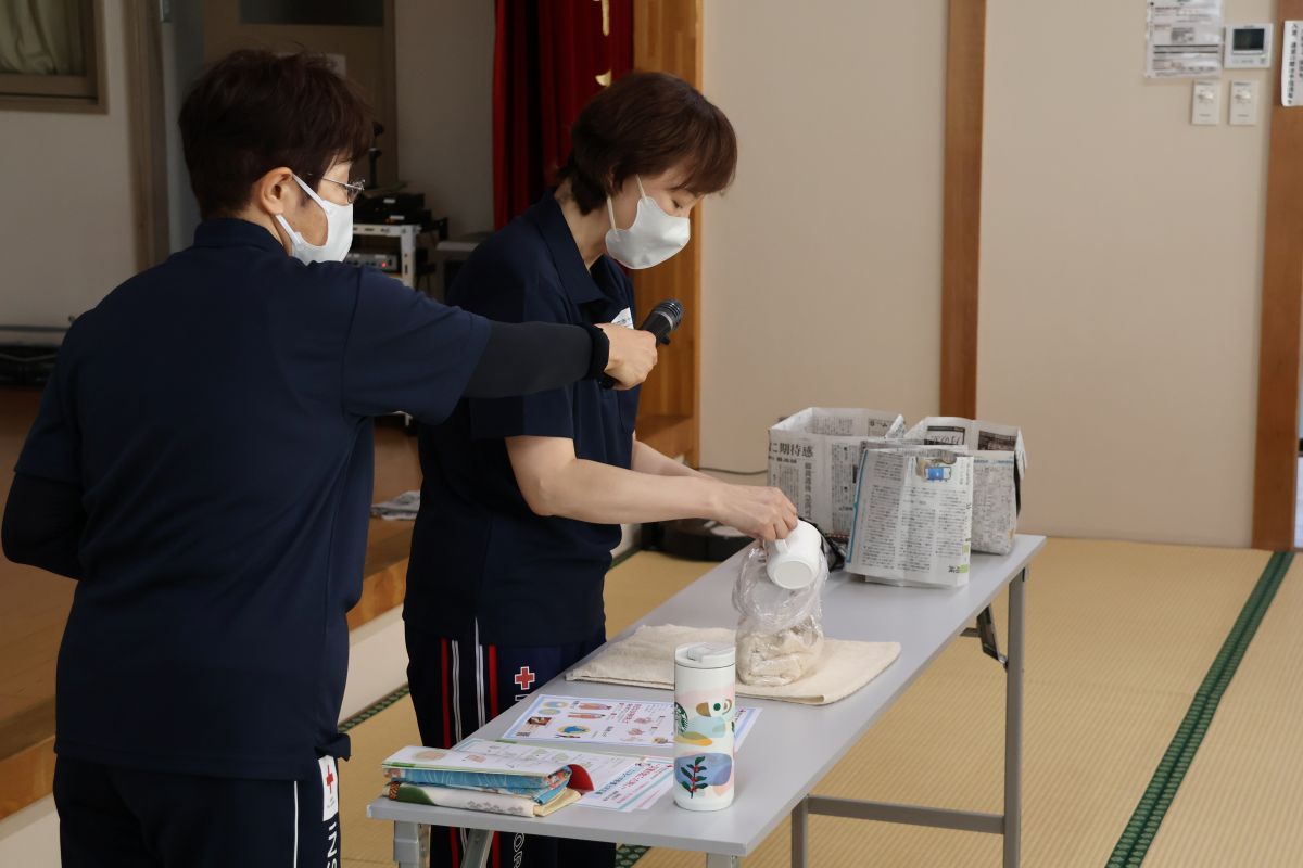 講師の細井指導員からは、避難所で役に立つゴミ箱、小物入れや足カバーの作り方の実践や水を節約したホットタオルの作り方の紹介がありました(講義のポイントは、別添資料を参照)。