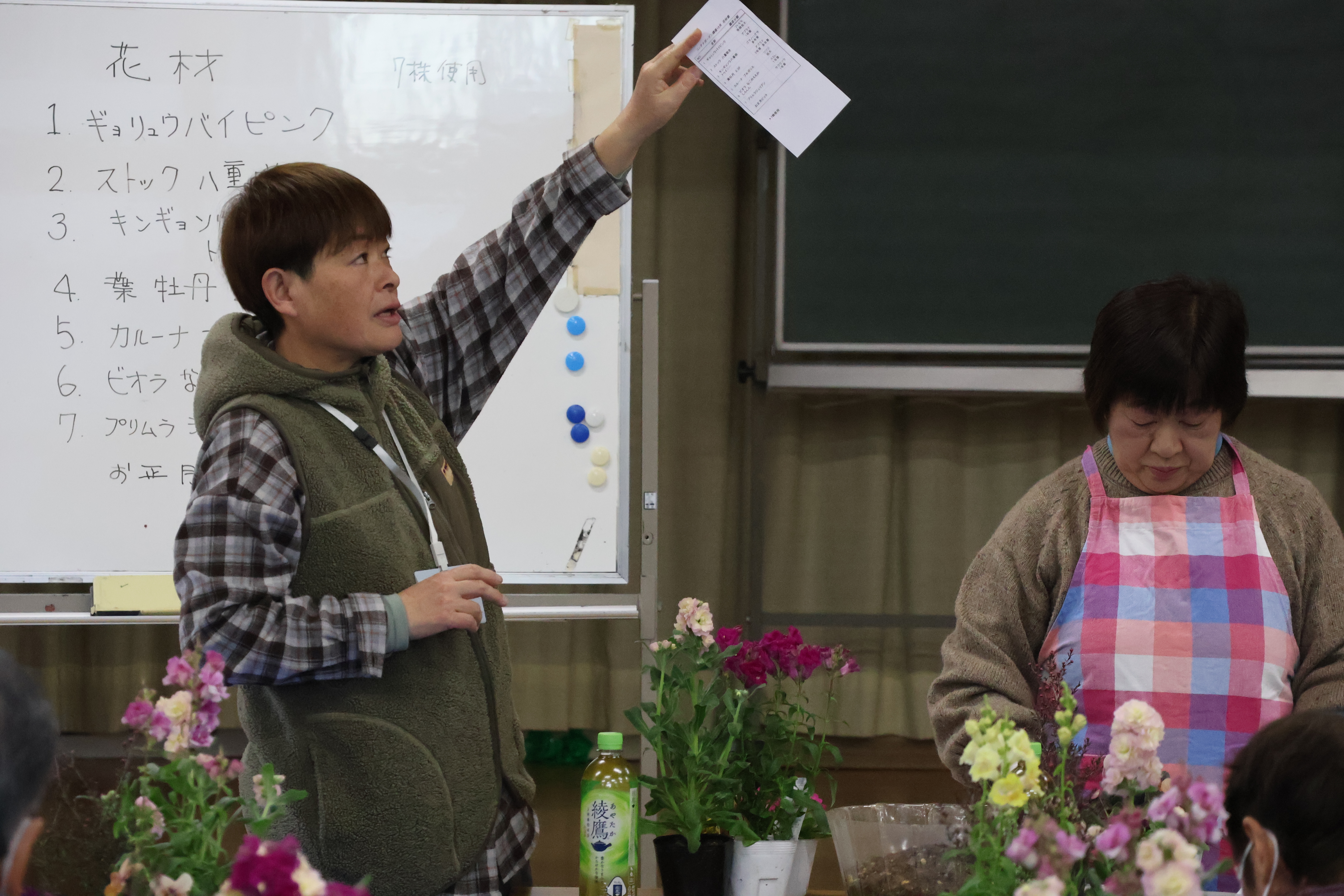 12月の「ふれあいいきいきサロン」は、お正月にふさわしい華やかな寄せ植え教室で28名の参加があり、今回が初めての参加者も多数いました。