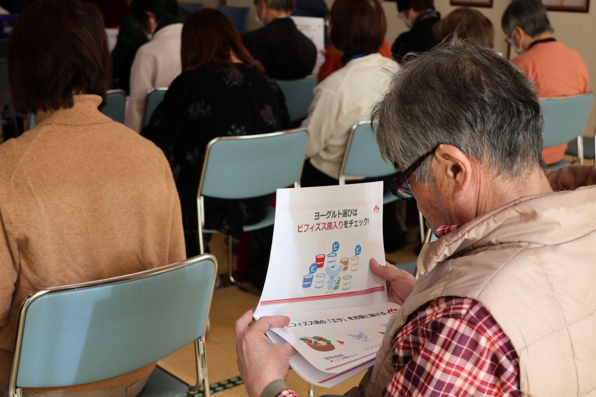 講話では骨の健康のお話のほか、各自の腸年齢チェックシートを基に、より良い腸内フローラやビフィジス菌・乳酸菌の働きや日々の食生活習慣を通じて将来の健康につながるお話しがありました。
