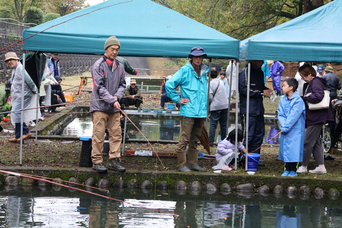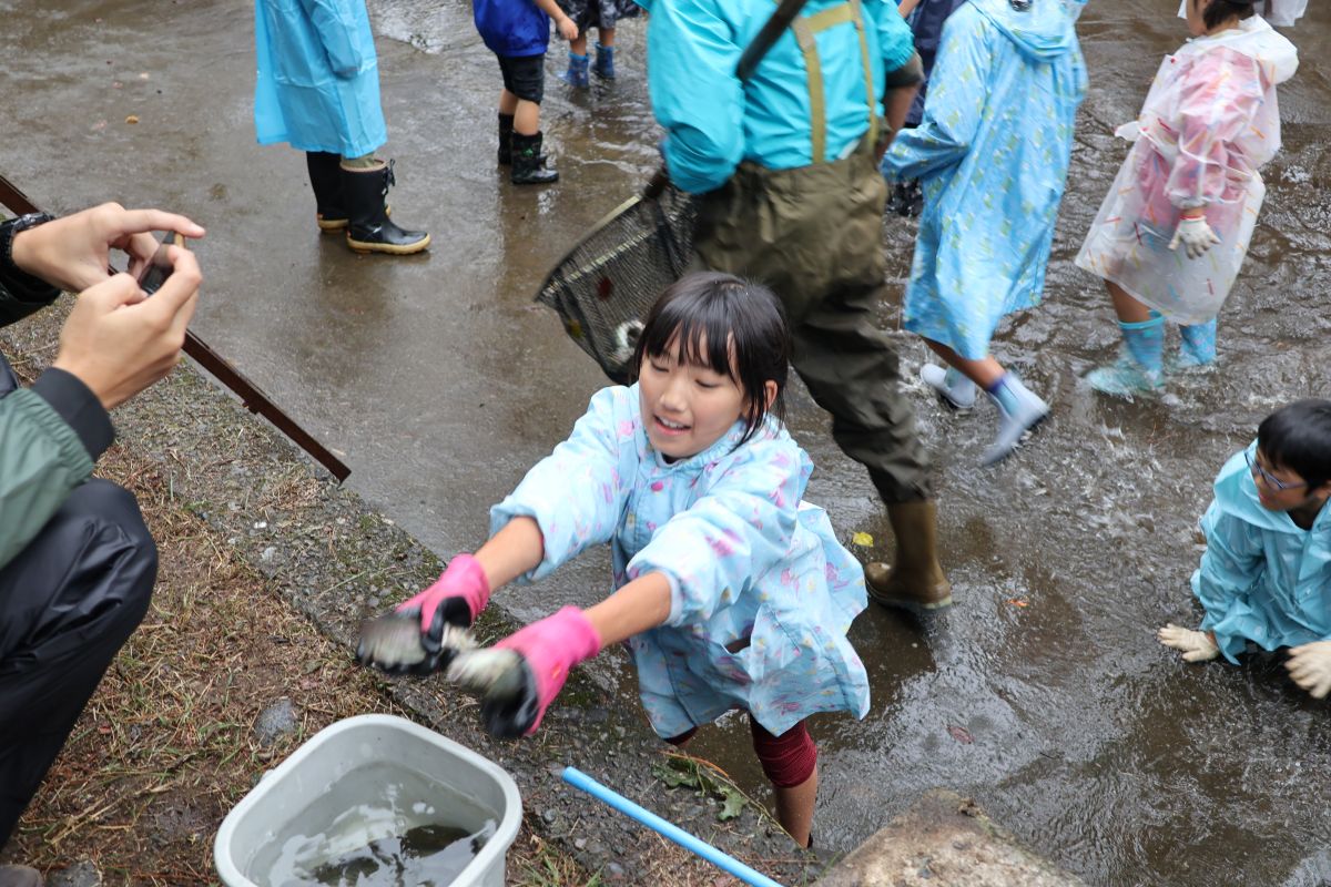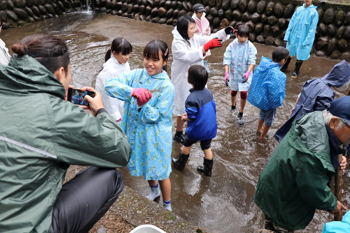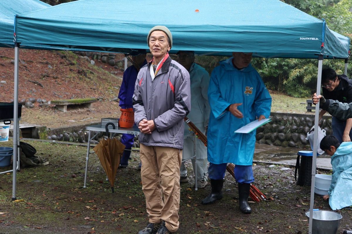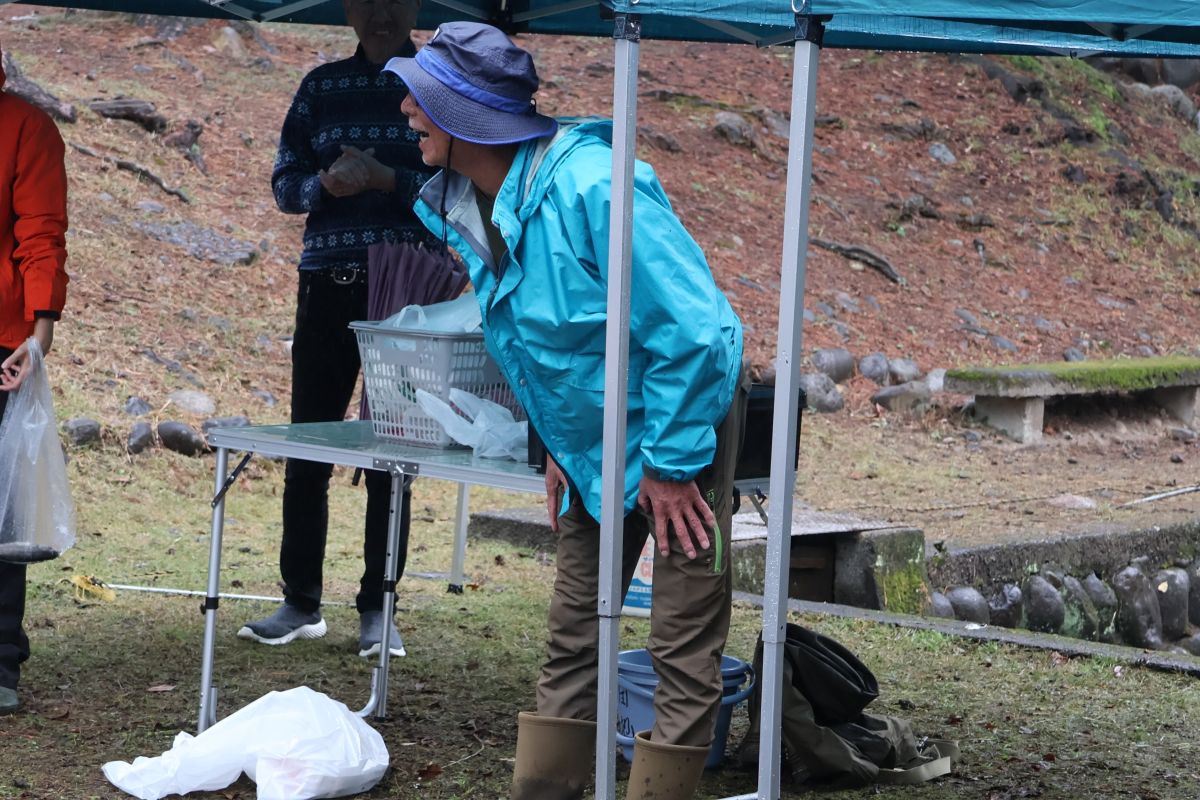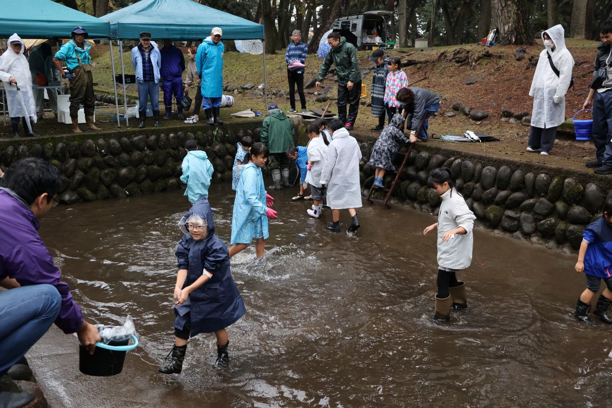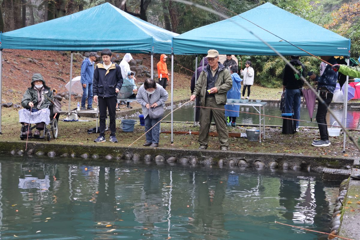小雨の中、最初は釣れなかったものの段々に慣れて釣れてくると歓声が大きくなりました。熟練者が初心者にコツを教えるなど、90歳台のお年寄りから未就学児まで大いに楽しめたようです。その後、子供たちによるつかみ取りで大歓声の中盛り上がり、行事は無事終了しました。