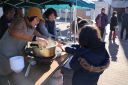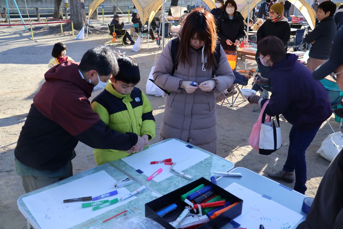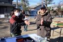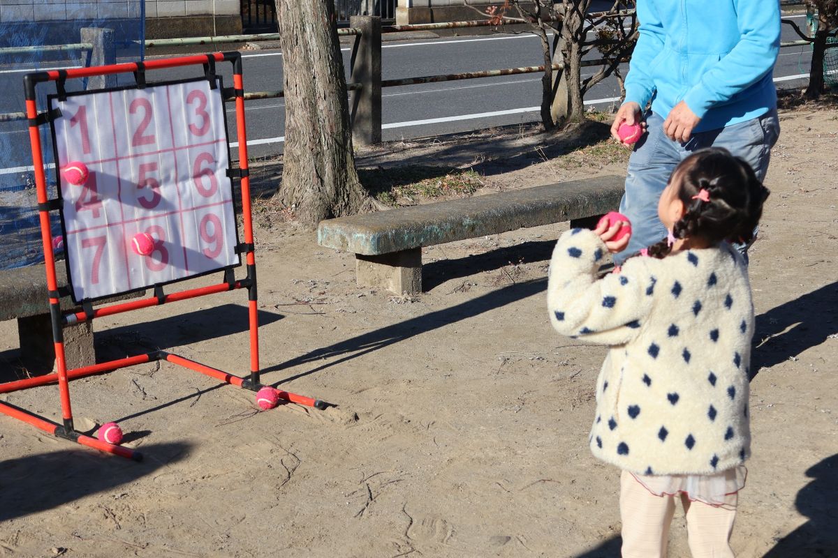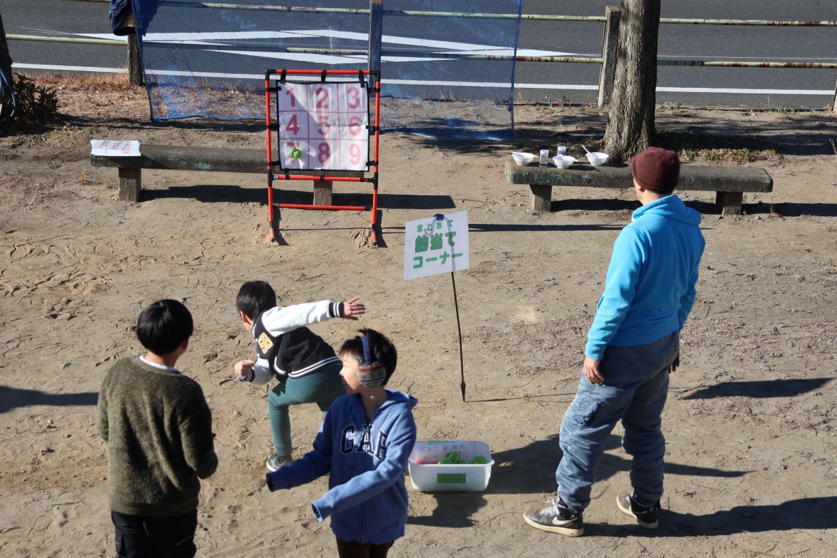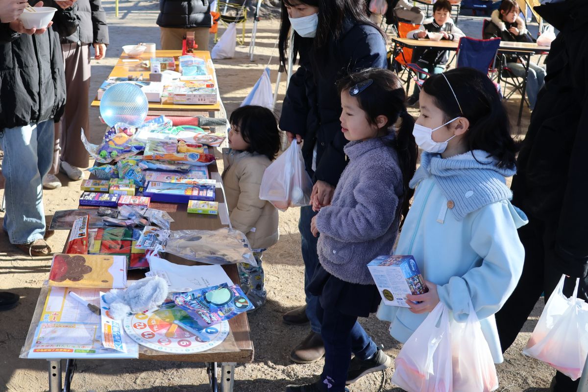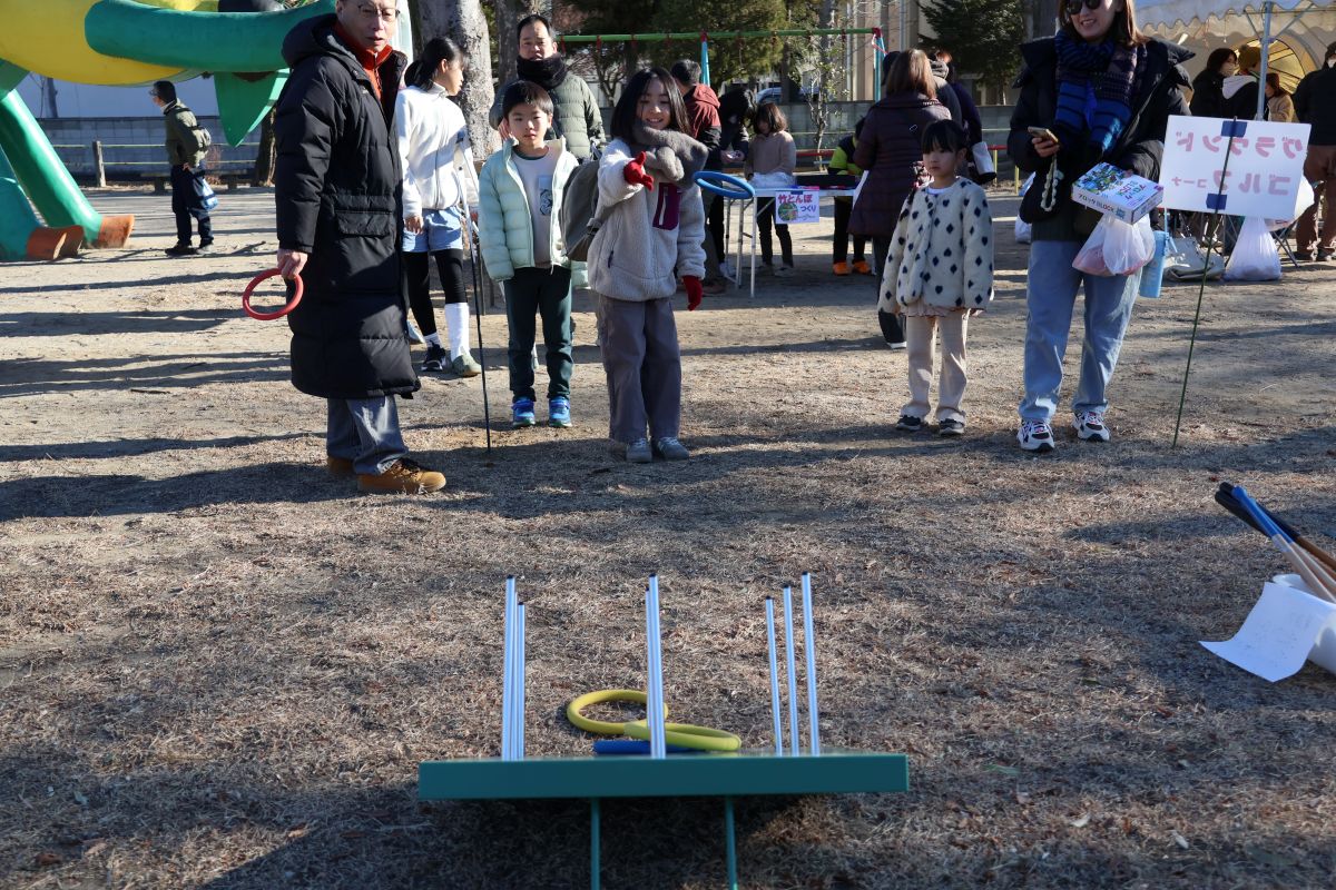 参加者には暖かい「豚汁」、稲荷ずし」、「ミカン」、「飲み物」などが振舞われ、子供達には「お楽しみ抽選」、「グラウンドゴルフ」、「輪投げ」や「的当てのゲーム」に加え、今年は「竹とんぼつくり」が加わり、お年寄りから子供までお正月の交流を楽しんでいました。