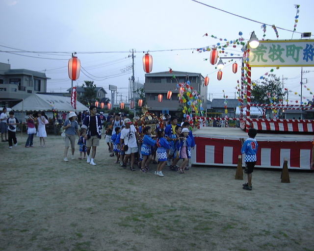 午後5時半に正式に祭りが開始となり、子どもみこし、子ども八木節、民謡踊り、ダンス、だんべえ踊り等が披露されました。また、来場者には焼きそば、綿菓子、ポップコーン、ラムネ等が振舞われ、子どもたちに好評の金魚のつかみ取りも開催されました。