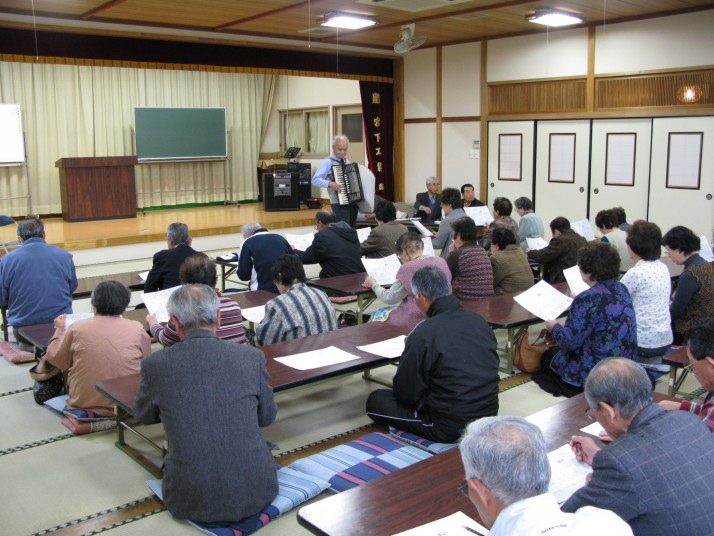 昨年同様に、北爪先生のアコーディオンの伴奏で、先生用意の歌集で懐かしいナツメロ等を皆で合唱しました。また、歌に併せて手遊びや頭を柔軟にする頭の体操などをしながら大声で歌い、笑い、楽しみました。
