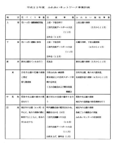 各地区(5地区)の地区代表さんより、平成22年度事業計画(別図)として「花づくり事業」「交流事業」「ふれあい福祉活動」について発表がありました。