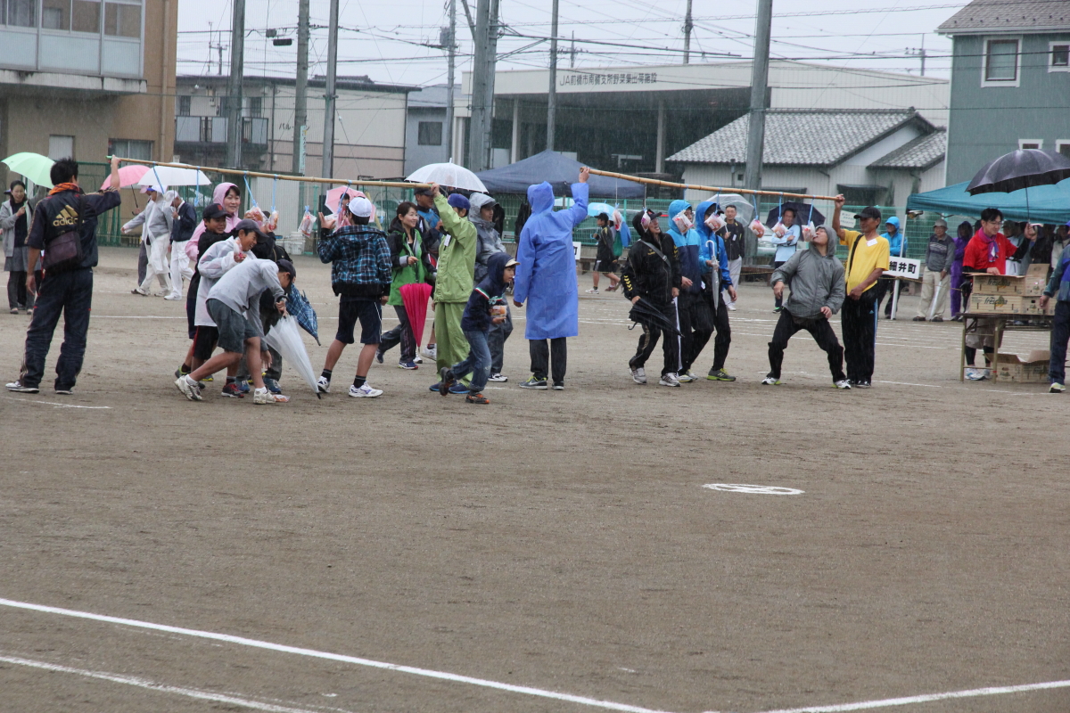 台風18号の接近で昨夜から雨模様が心配されましたが、朝は小雨のため各家庭に配布された運動会プログラムを雨天用に変更し行われました。入場行進は行わず、開会式も簡略して始まりましたが、天候の様子から急遽変更して「パン食い競争」のみの運動会になりました。荒牧町からも、幼児から大人まで「パン食い競争」に参加して一時を楽しんでいました。