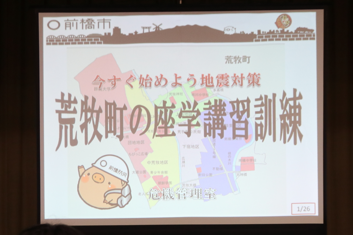 はじめに、脇荒牧町自主防災会長(自治会長)から挨拶と会議の趣旨説明で始まりました。次に、講師から「今すぐ始めよう地震対策 荒牧町の座学講習訓練」としてプロジェクタで説明を受けました。