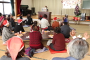 今回は、「前橋市地域包括支援センター南橘」の4名の職員の皆さんも一緒に加わり、配布されたサンタ帽子等を皆が被り茶菓子等をいただきながら、おしゃべりで楽しく皆さんと交流を深めたり、職員との個別相談などをしていました。続いて、藤川民生・児童委員さんが紙芝居「その後の金色夜叉」を披露したり、介護予防サポーター会の指導で、「ピンシャン元気体操」をして楽しく過ごしていました。