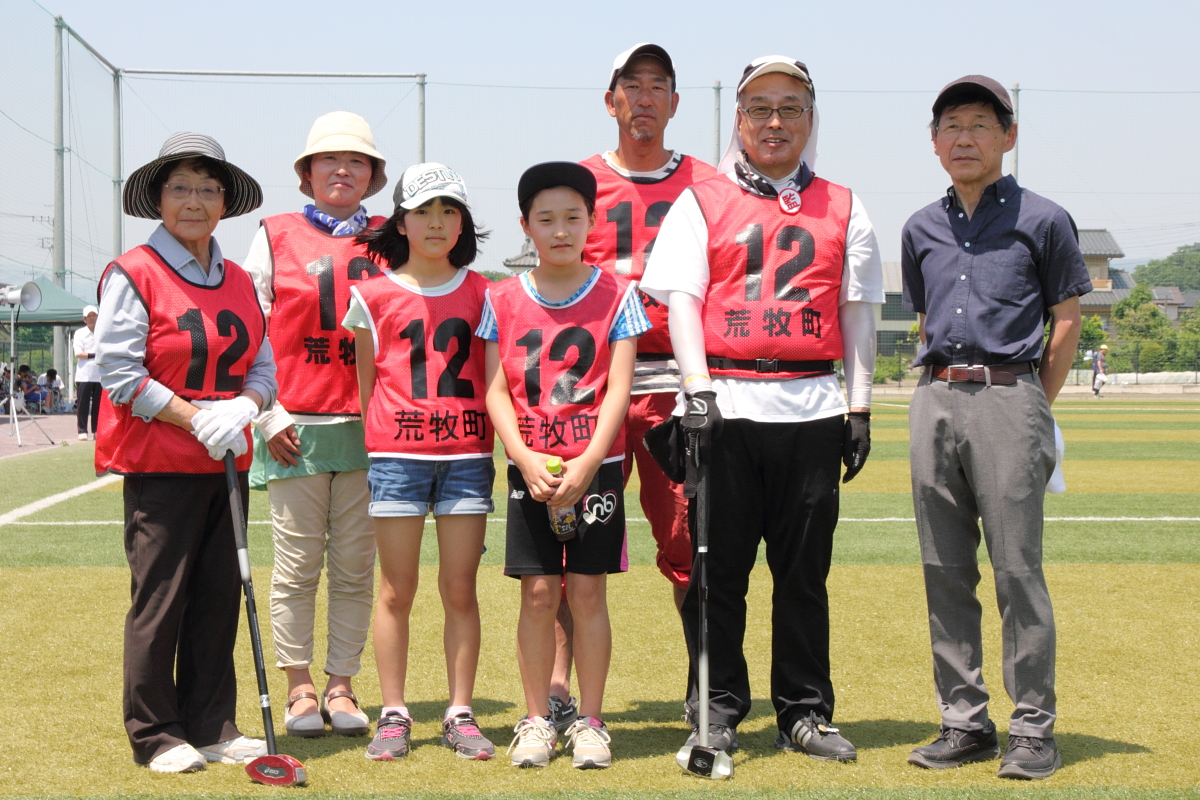 南橘地区13町から各町3チームの選手が参加し、1チーム男・女混合6名(高齢者2名・一般2名・子供2名)、女子は2名以上の編成で、南橘中学校の芝生グラウンドをABCの3コートに分かれての大会でした。荒牧町からも1チーム6名がABCの各3コース(18名)に参加し、8ホールを競技しました。成績は下の「成績表」のとおり第7位でした。ホールインワンが全体で27名の方々が出しましたが、荒牧町からは3名が出し表彰されました。