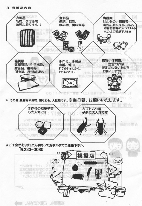 開催日:10月19日(日) 10時〜11時30分 会 場:南橘中体育館 出品のお願いと出品物については別文参照 |