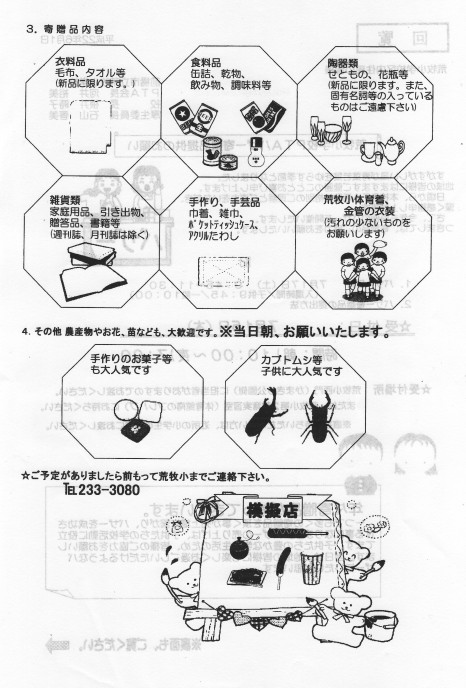 バザー日時:7月17日(土) 9:45〜11:30 寄贈品受付日:7月15日(木) 10時〜19時 荒牧小西門に担当者がおります 寄贈品内容:別図参照 |