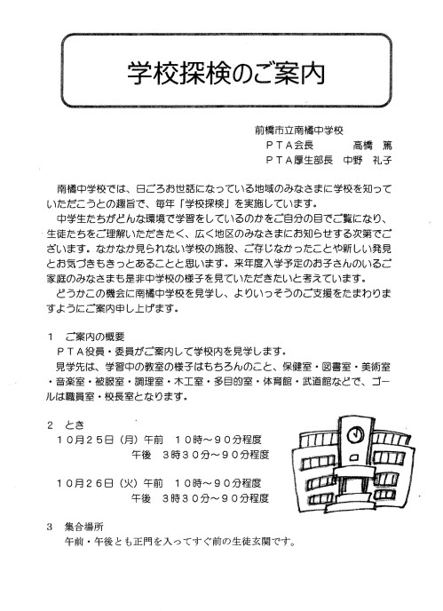 | 9 | 学校探検のご案内 | 南橘中学校PTA |