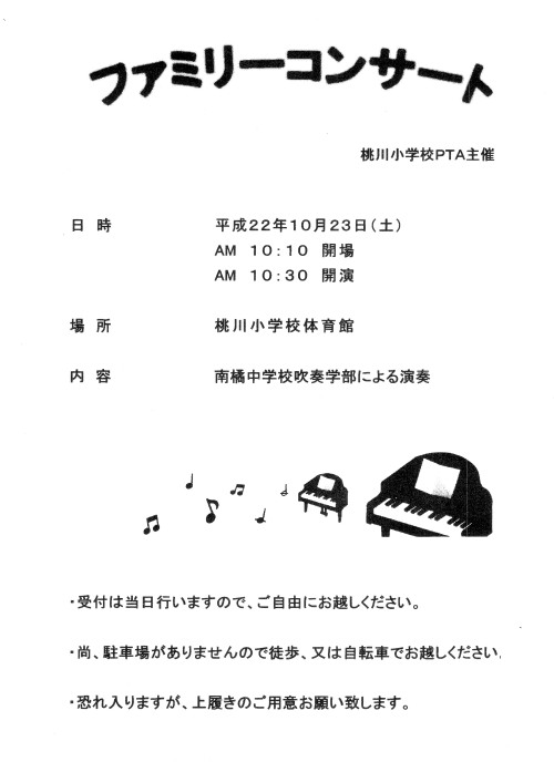 日時:10月23日(土) 10時30分開演 場所:桃川小学校体育館 内容:南橘中学校吹奏楽部による演奏 お待ちしております。 |